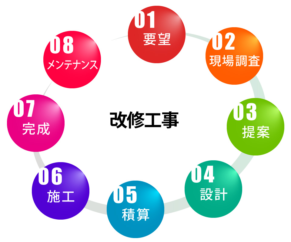 当社では、リニューアルの調査・診断から提案・施工・メンテナンスまでを一貫して行うトータルサポートを実施しています。